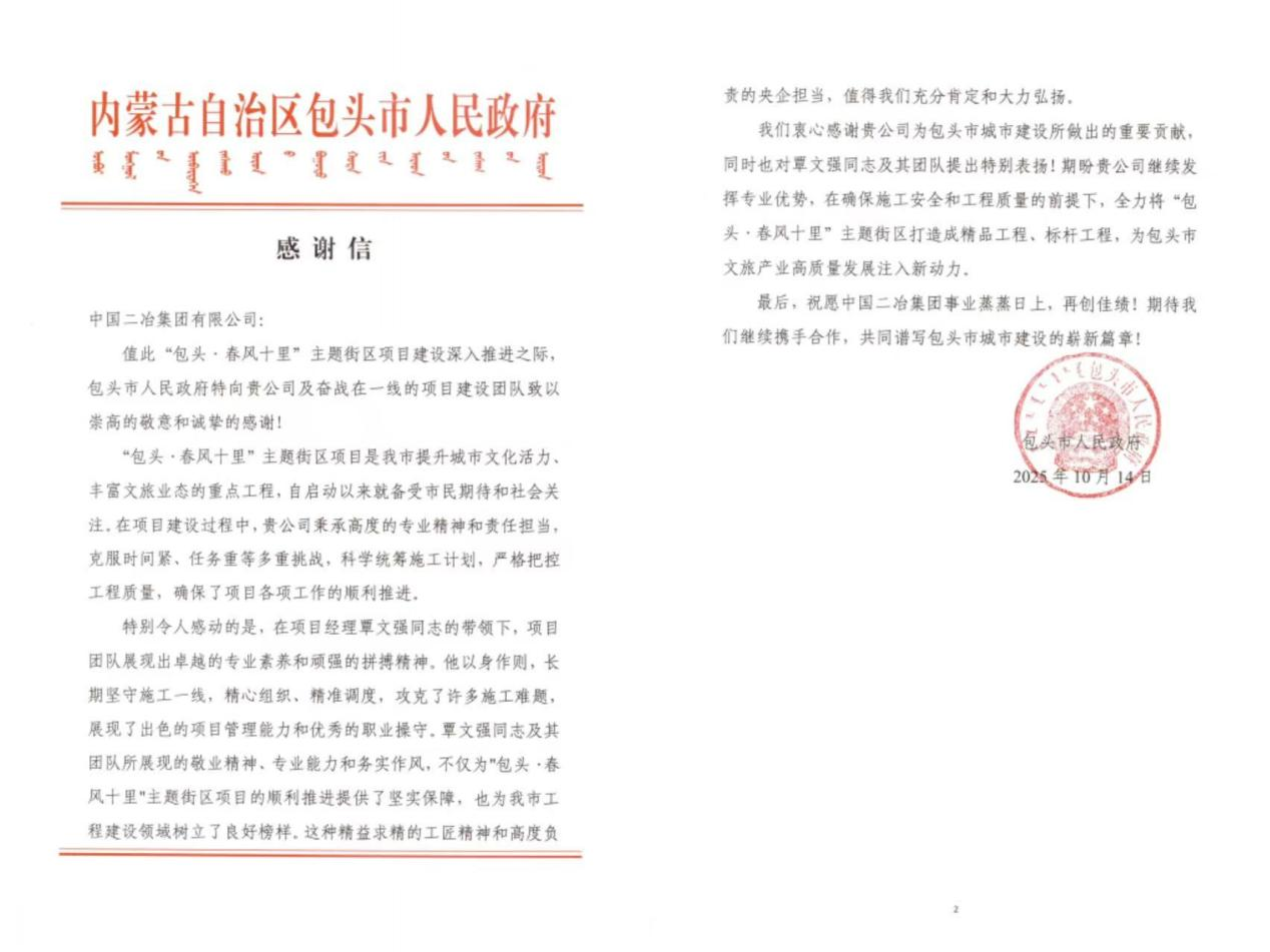 這封感謝信不僅是對中國二冶項目團隊攻堅克難、高效履約的高度認(rèn)可,更是對中國二冶秉持工匠精神、踐行央企責(zé)任擔(dān)當(dāng)?shù)挠辛τ∽C。中國二冶將以此為激勵,持續(xù)發(fā)揮專業(yè)優(yōu)勢,在嚴(yán)守施工安全與工程質(zhì)量的前提下,全力將“包頭?春風(fēng)十里”主題街區(qū)打造成精品工程、標(biāo)桿工程,為包頭市文旅產(chǎn)業(yè)高質(zhì)量發(fā)展注入更多二冶力量。
