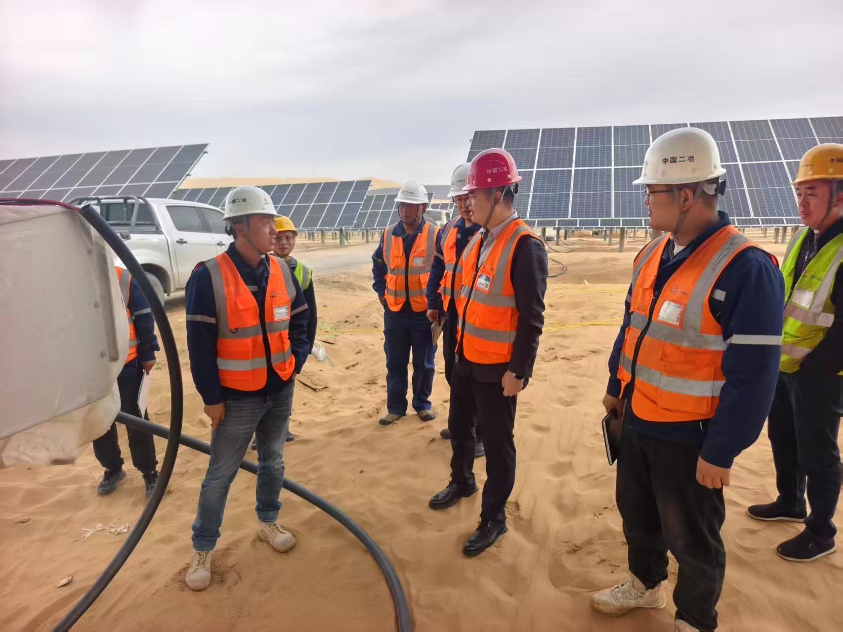米宏達(dá)深入各子陣查看光伏組件的安裝質(zhì)量和布局情況,確保光伏組件的安裝符合標(biāo)準(zhǔn),以提高發(fā)電效率。同時(shí),針對(duì)項(xiàng)目建設(shè)核心需求,米宏達(dá)提出三點(diǎn)要求,一是安全管理上,需針對(duì)沙漠施工風(fēng)沙、高溫等風(fēng)險(xiǎn),加強(qiáng)人員安全教育培訓(xùn)與現(xiàn)場(chǎng)管控,增設(shè)警示標(biāo)志、配齊防護(hù)設(shè)備,守住安全生命線;二是質(zhì)量把控上,堅(jiān)持“質(zhì)量第一”,從設(shè)備采購(gòu)到安裝調(diào)試全環(huán)節(jié)嚴(yán)把關(guān),建立問題臺(tái)賬實(shí)行閉環(huán)管理,打造高標(biāo)準(zhǔn)工程;三是進(jìn)度推進(jìn)上,圍繞2025年11月15日并網(wǎng)目標(biāo),制定詳細(xì)施工計(jì)劃,加強(qiáng)多部門協(xié)調(diào),快速解決建設(shè)難題,確保按期完工。?